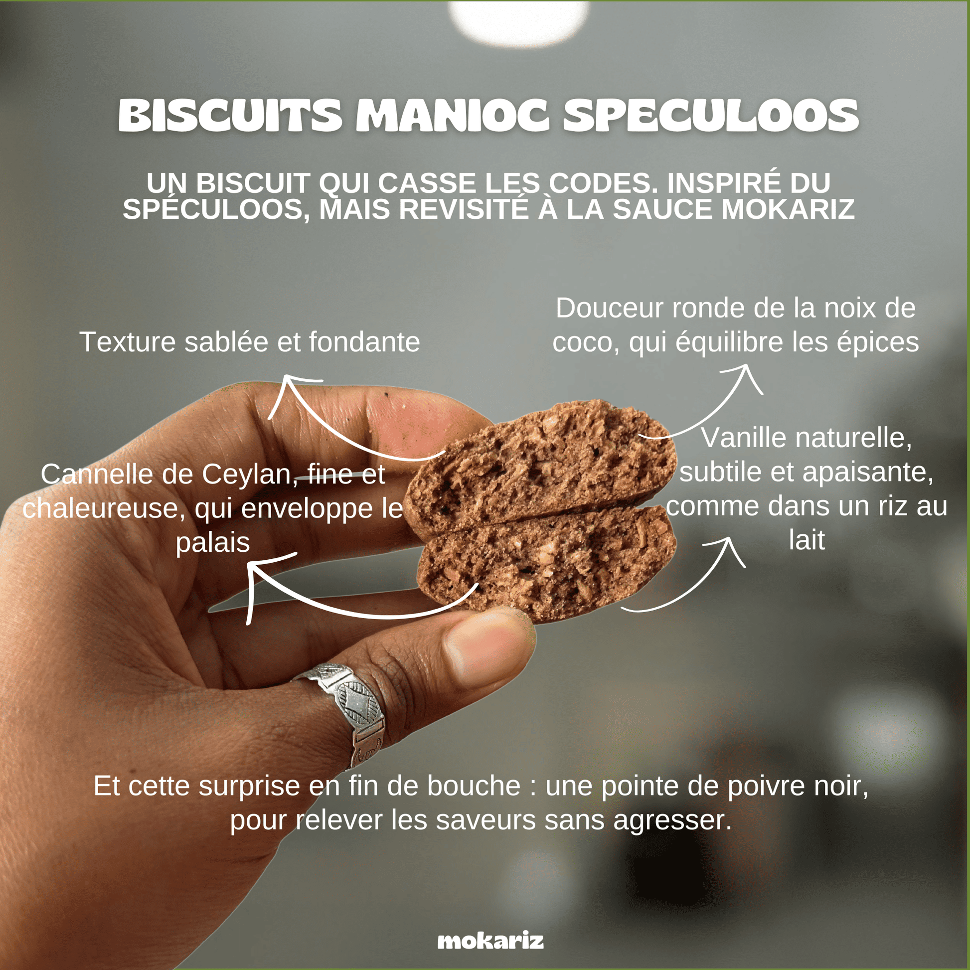 Voici un biscuit qui casse les codes. Inspiré du spéculoos, mais revisité à la sauce Mokariz : sans farine de blé, sans lait, sans œuf — et pourtant intensément savoureux, croustillant, parfumé. On y retrouve tout le confort d’un biscuit maison, avec une signature bien à lui.