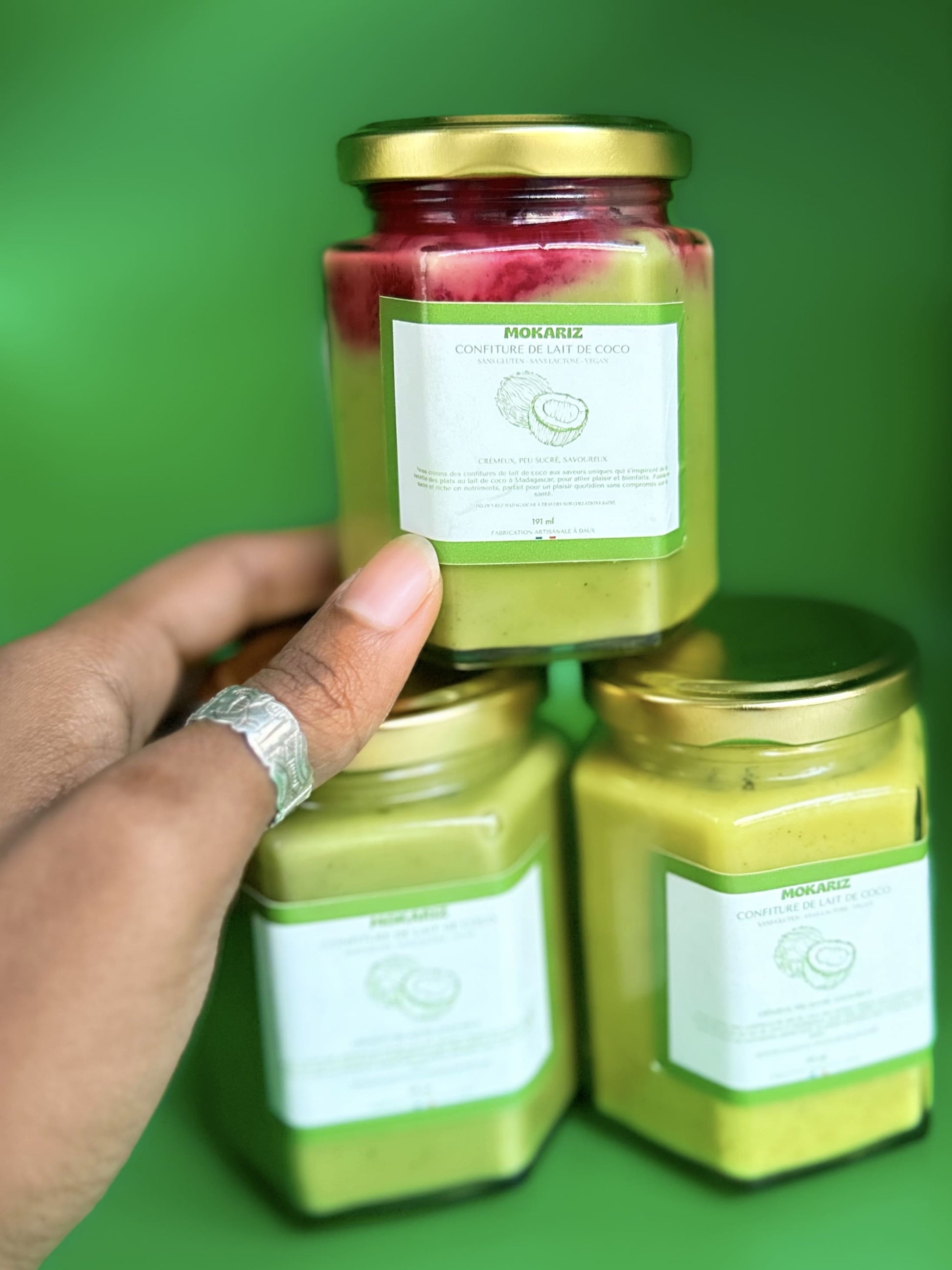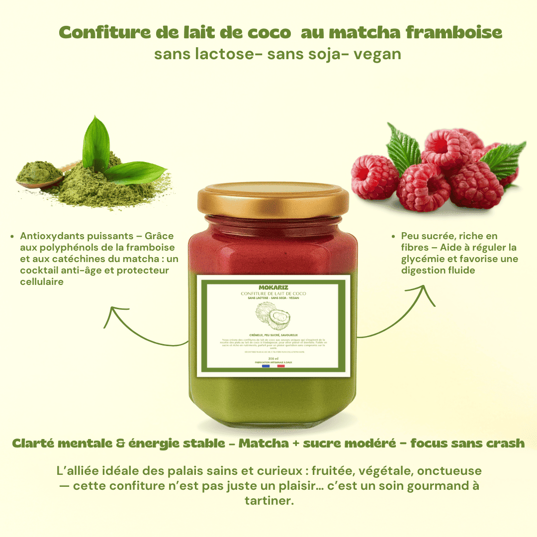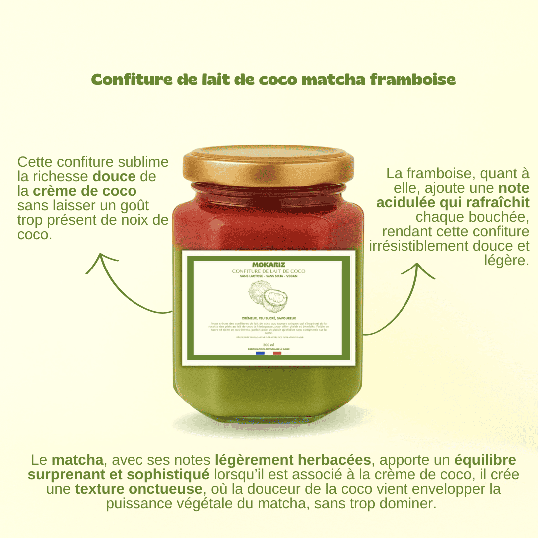 Découvrez la confiture de lait de coco au Matcha framboise une fusion parfaite de matcha et framboise, pour une expérience gustative unique. Cette confiture malgache sans gluten, sans lactose et vegan est idéal pour ceux qui recherchent un équilibre subtil entre douceur et fraîcheur.